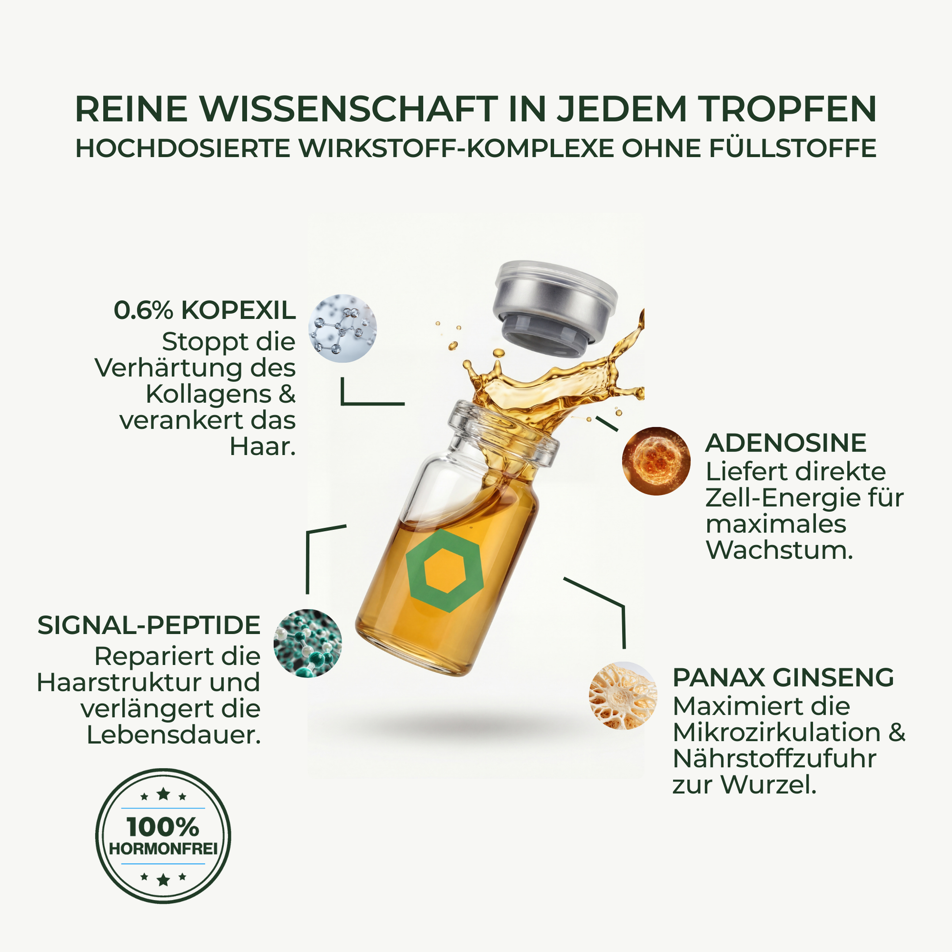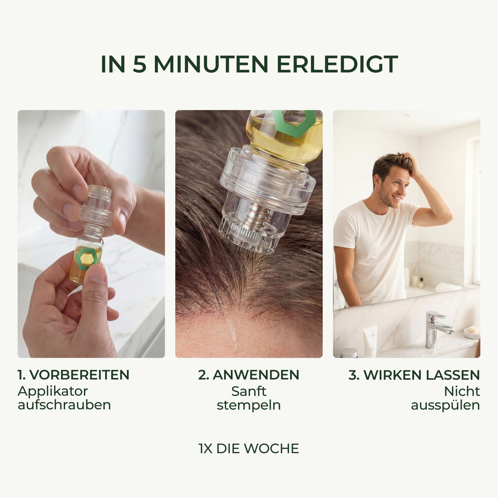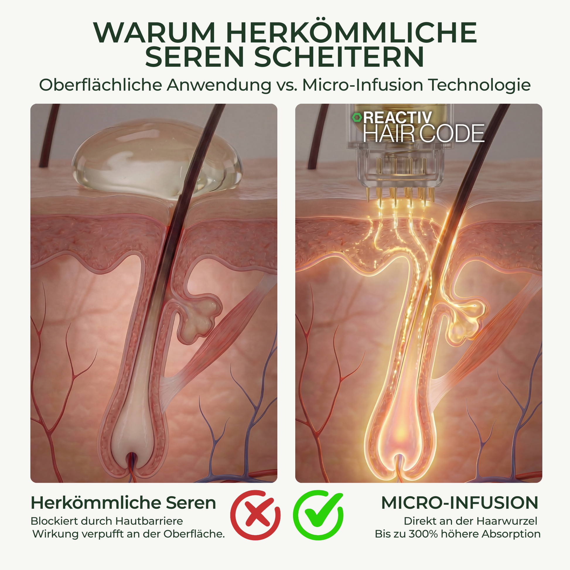 Verschwende kein Geld mehr. 90% herkömmlicher Mittel verdunsten wirkungslos. Deine Haarwurzeln verhungern und deine Haare erkleben. Sie erreichen die Follikel – das Kraftwerk deiner Haare – oft gar nicht.